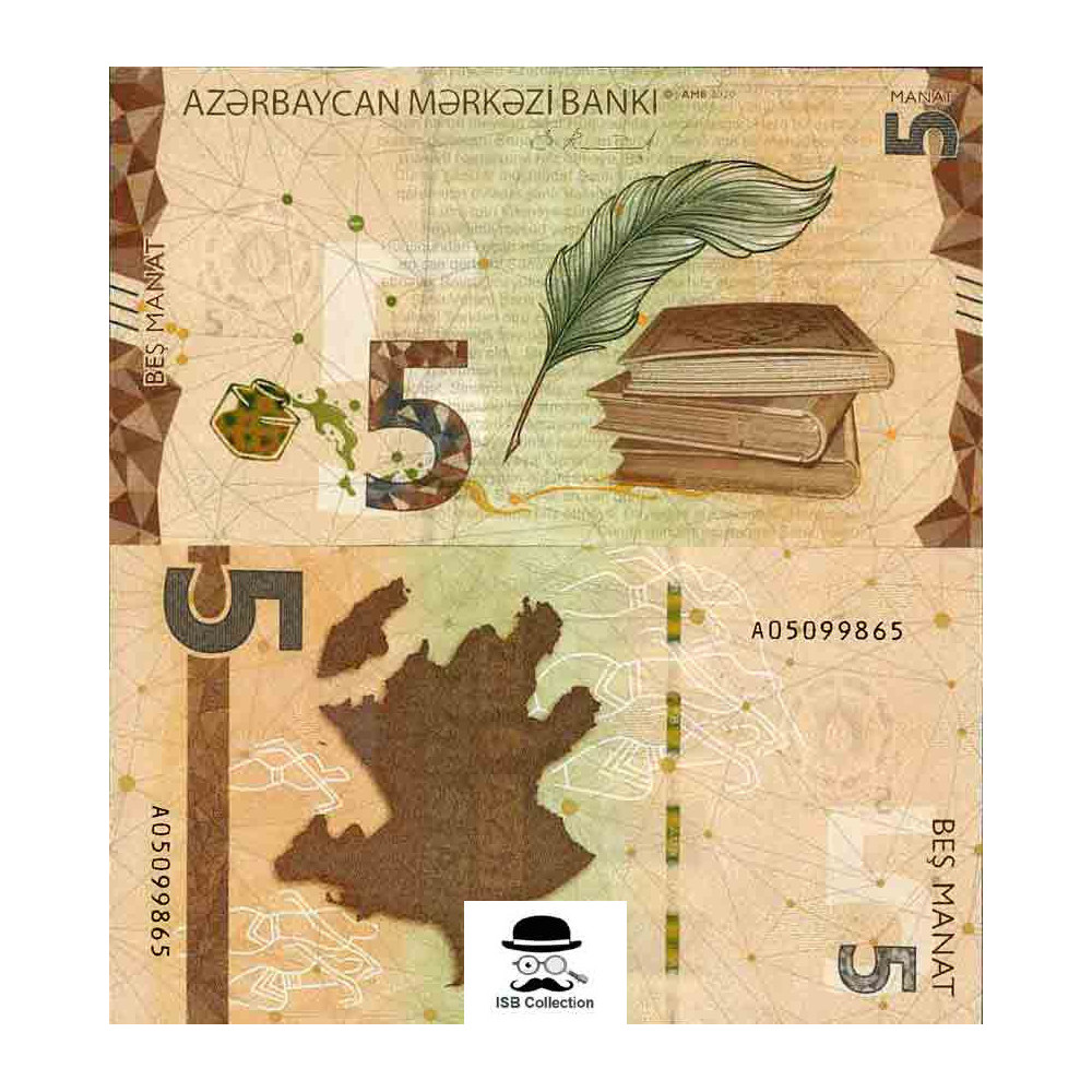 Billet de banque de azerbaïdjan valeur faciale 5 manat pick 39 - carte de l'azerbaïdjan avec des figures stylisées représenarnt des livres et un plumier.