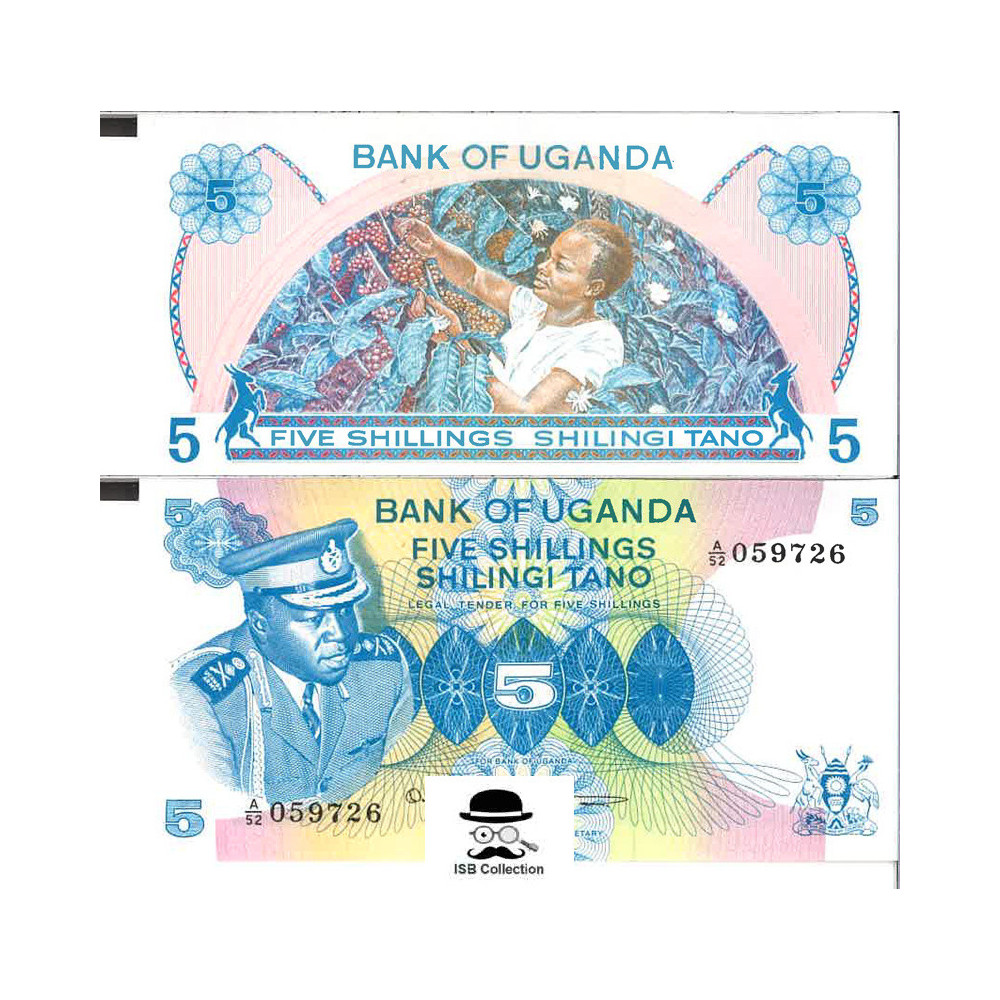 Billet de banque de ouganda valeur faciale 5 shillings pick 5 a- président idi amin dada et la récolte de café