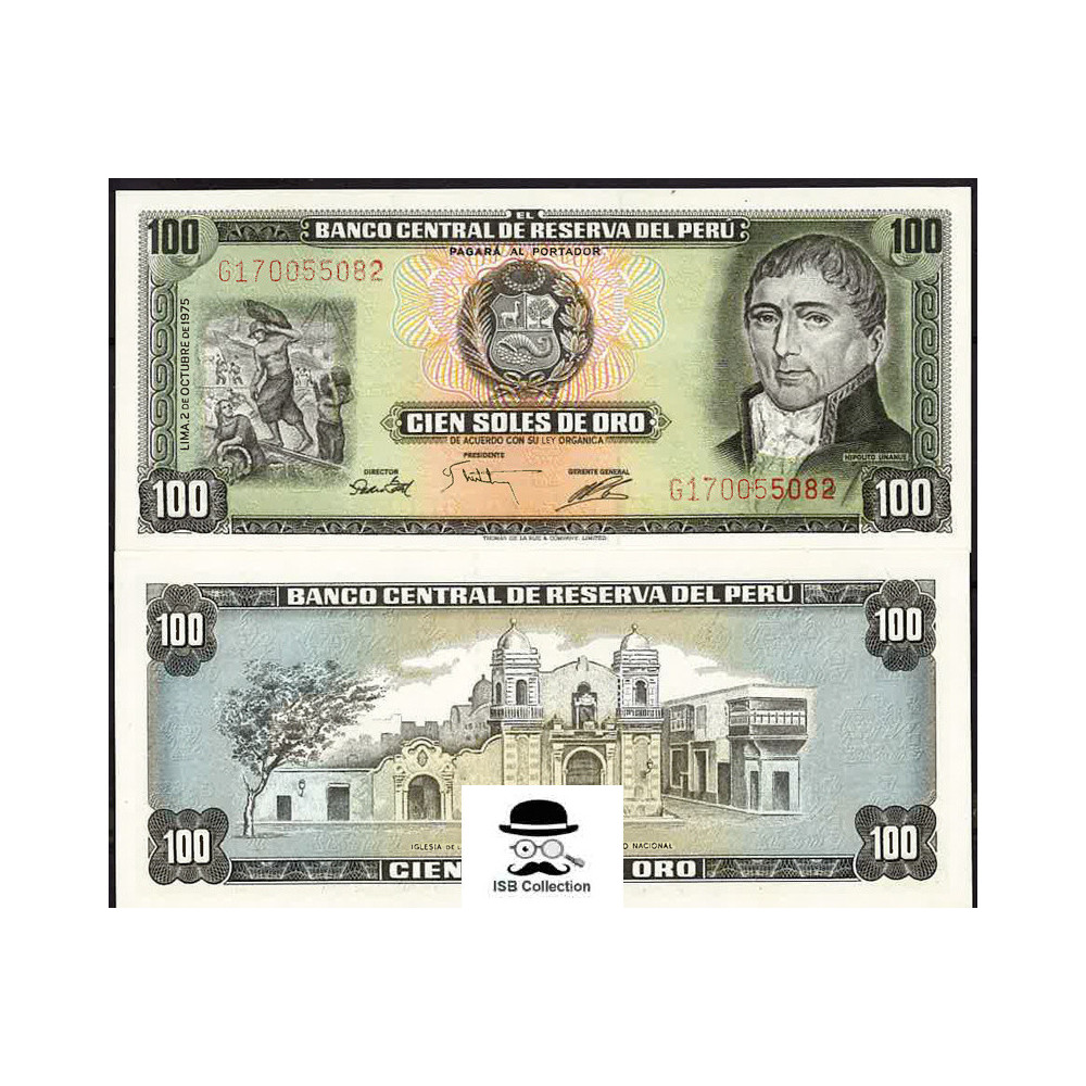 Billet de banque de pérou valeur faciale 100 intis pick 108 - sujets: hipólito unanue et l'église de la caridad (lieu du premier congrès national)