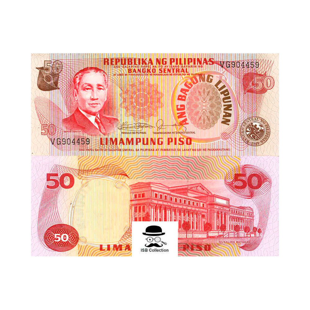 Billet de banque de philippines valeur faciale 50 pesos pick 163 - sujets: sergio osmeña et le palais législatif (aujourd'hui musée national), de manille