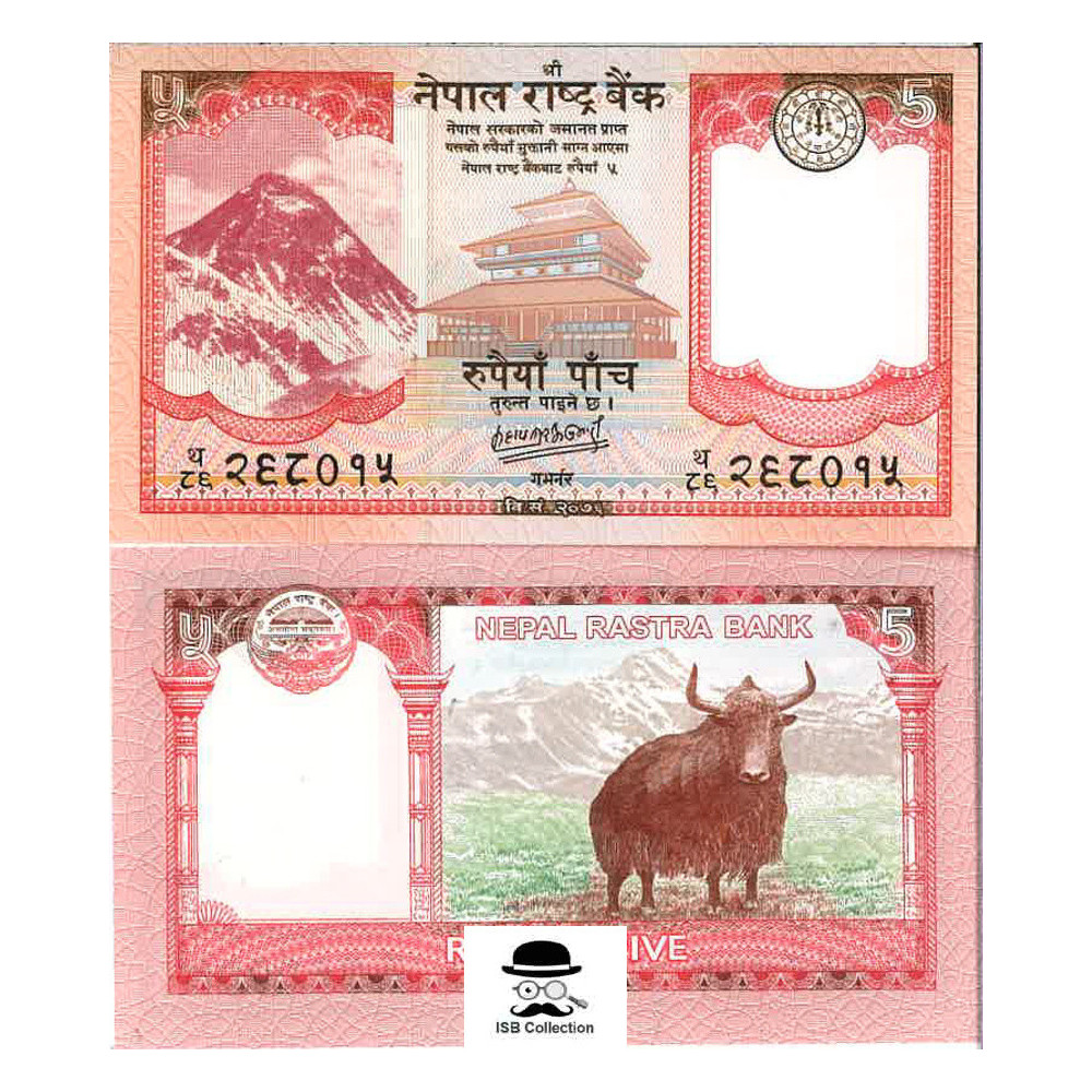 Billet de banque de népal valeur faciale 5 rupees pick 76 - sujets:mont everest, letemple taleju et un yak