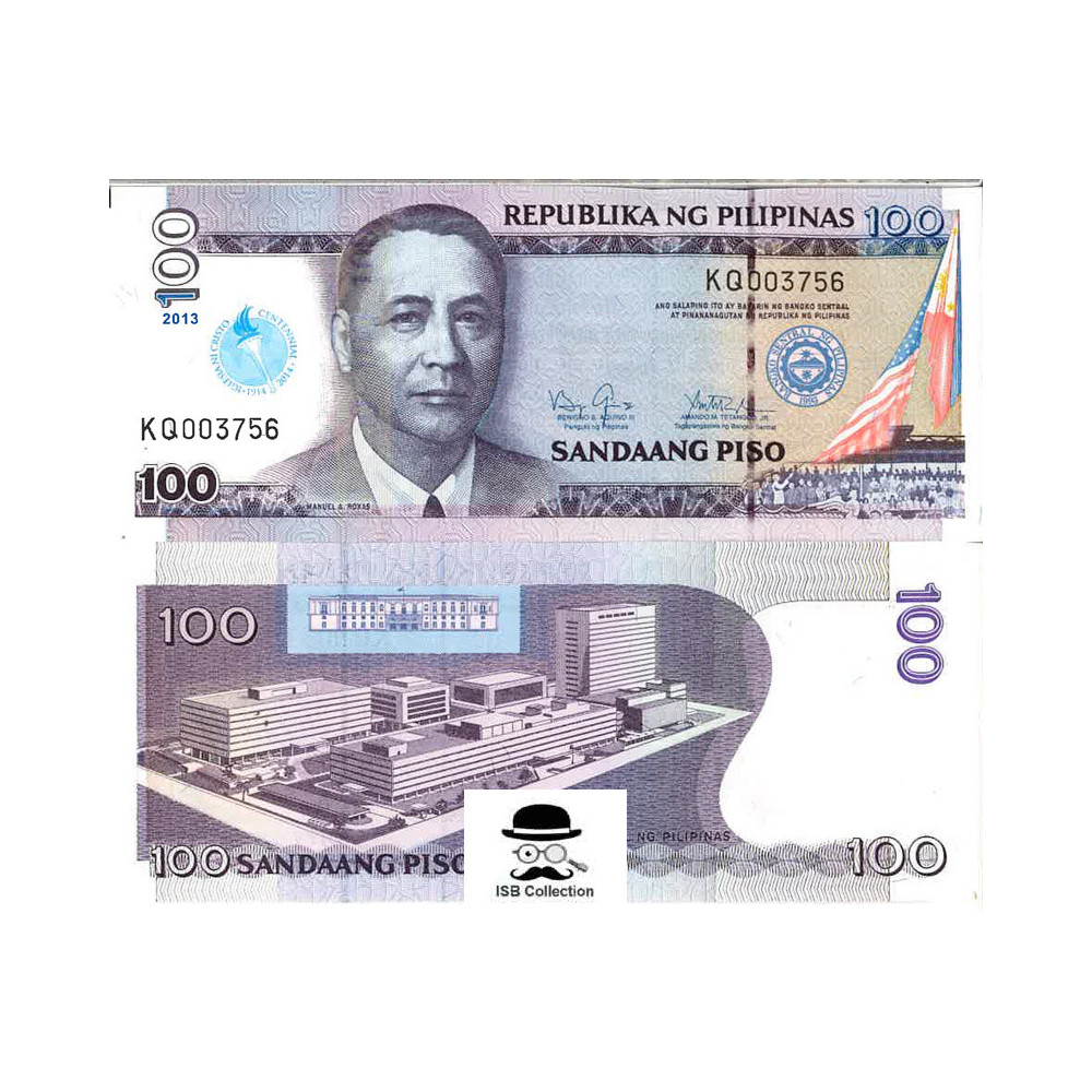 Billet de banque de philippines valeur faciale 100 pesos pick 221 - sujets: manuel roxas l'ancien bâtiment de la banque centrale et le nouveau bâtiment de la banque centrale des philippines